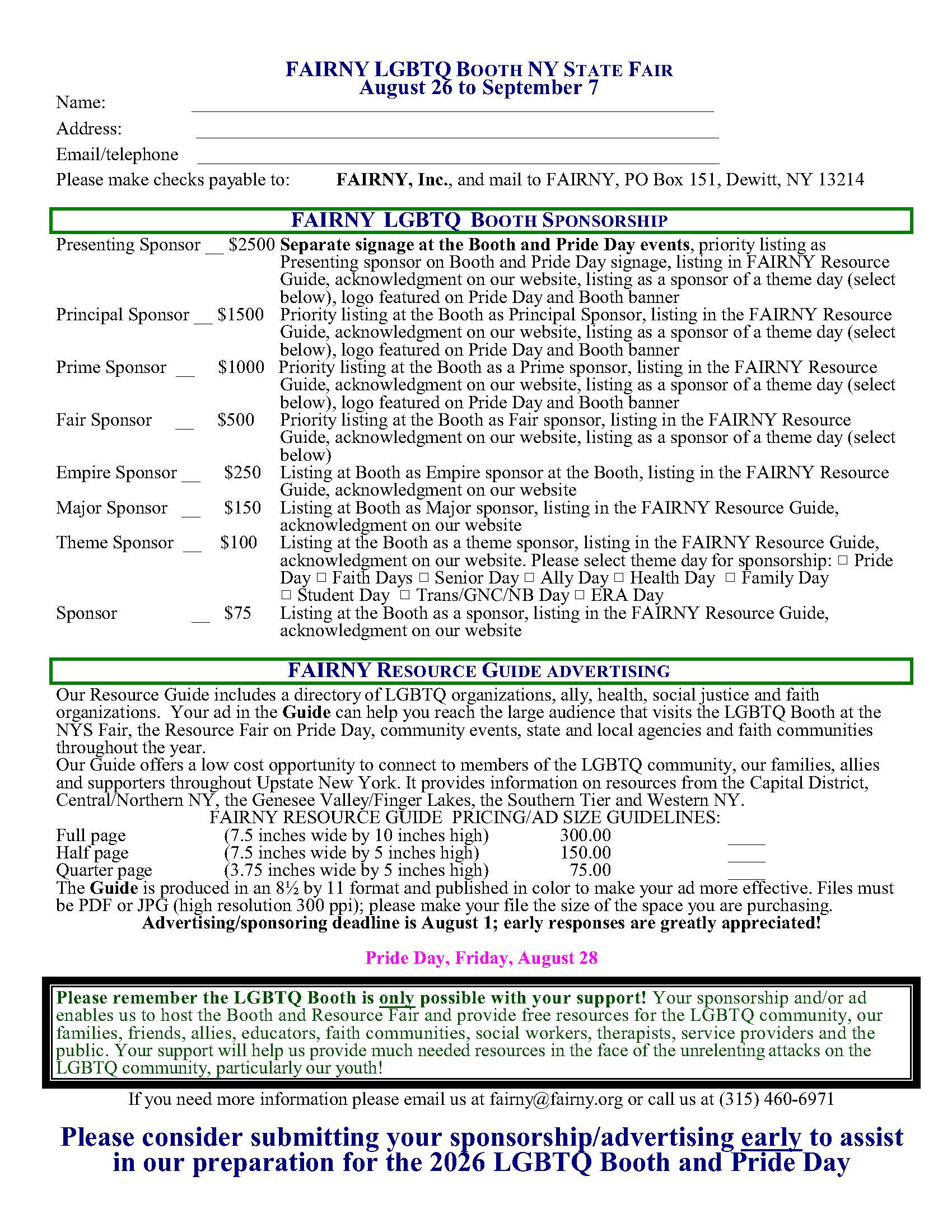 This form also provides information on how to advertise in the FAIRNY Resource Guide.
