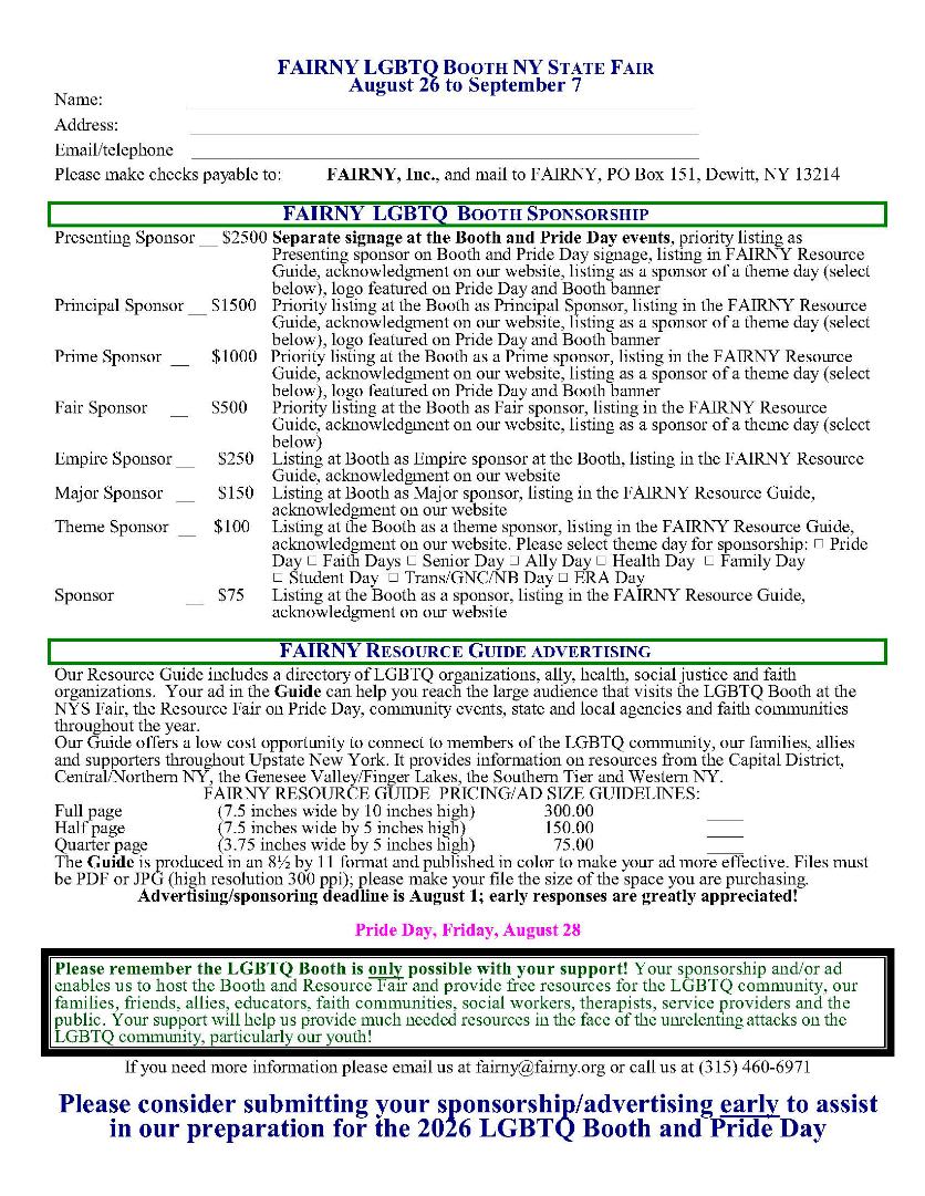 To support the LGBTQ Booth, please use the following form for sponsorship. The form can be printed or downloaded. Click on the printer icon to open a separate window to print the file or save it, or click the down arrow to download the file. You do not need to log in or sign up to print or download this form.